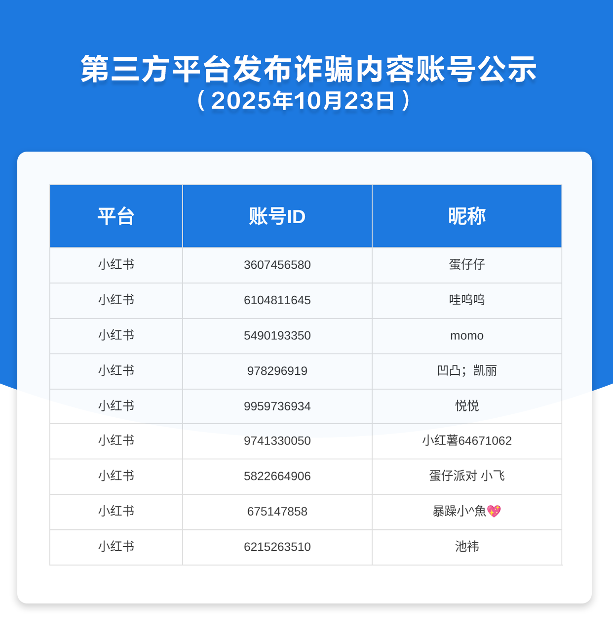 第三方平台发布诈骗内容账号公示(2025年10月23日)