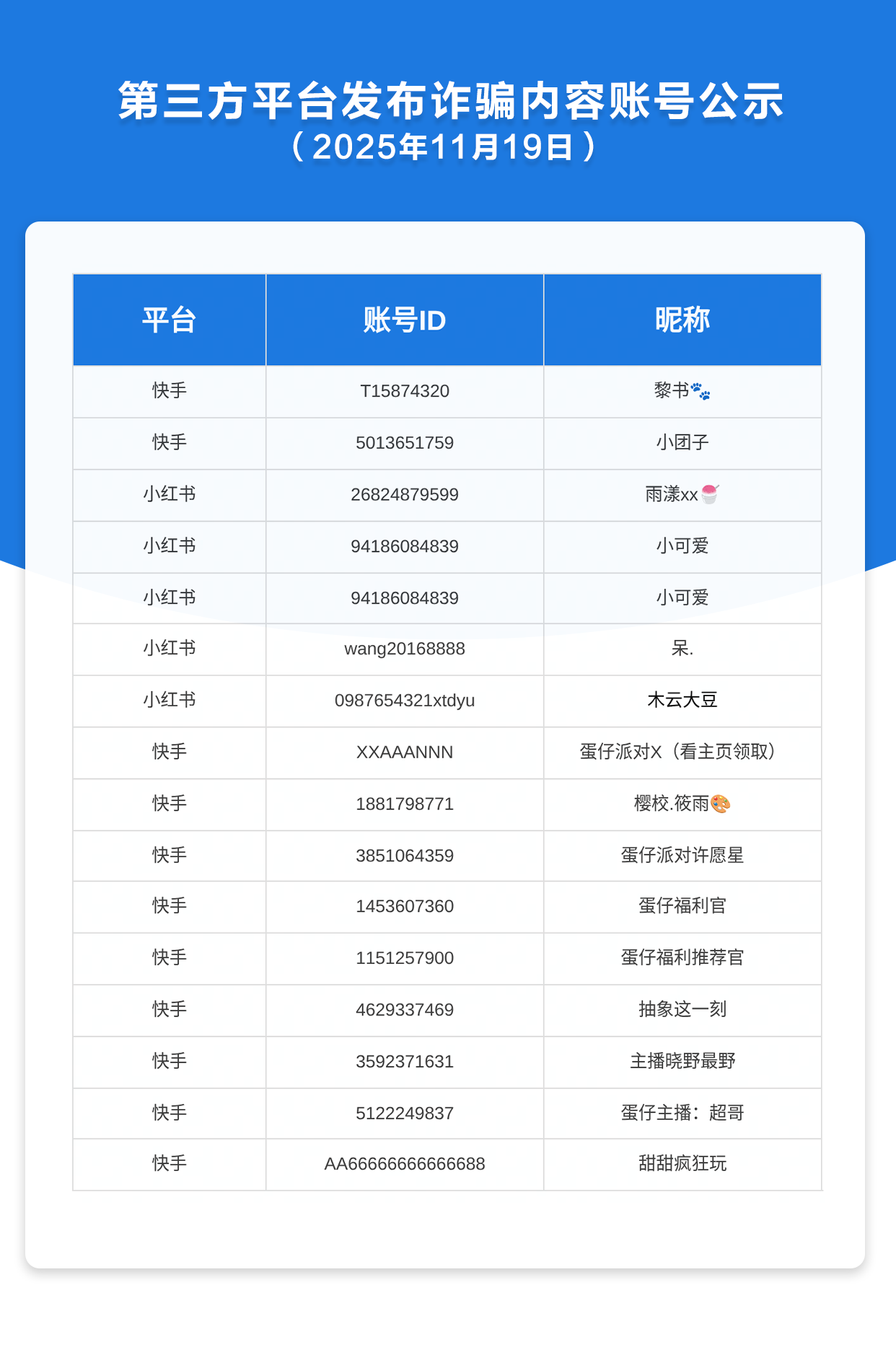 第三方平台发布诈骗内容账号公示(2025年11月19日)