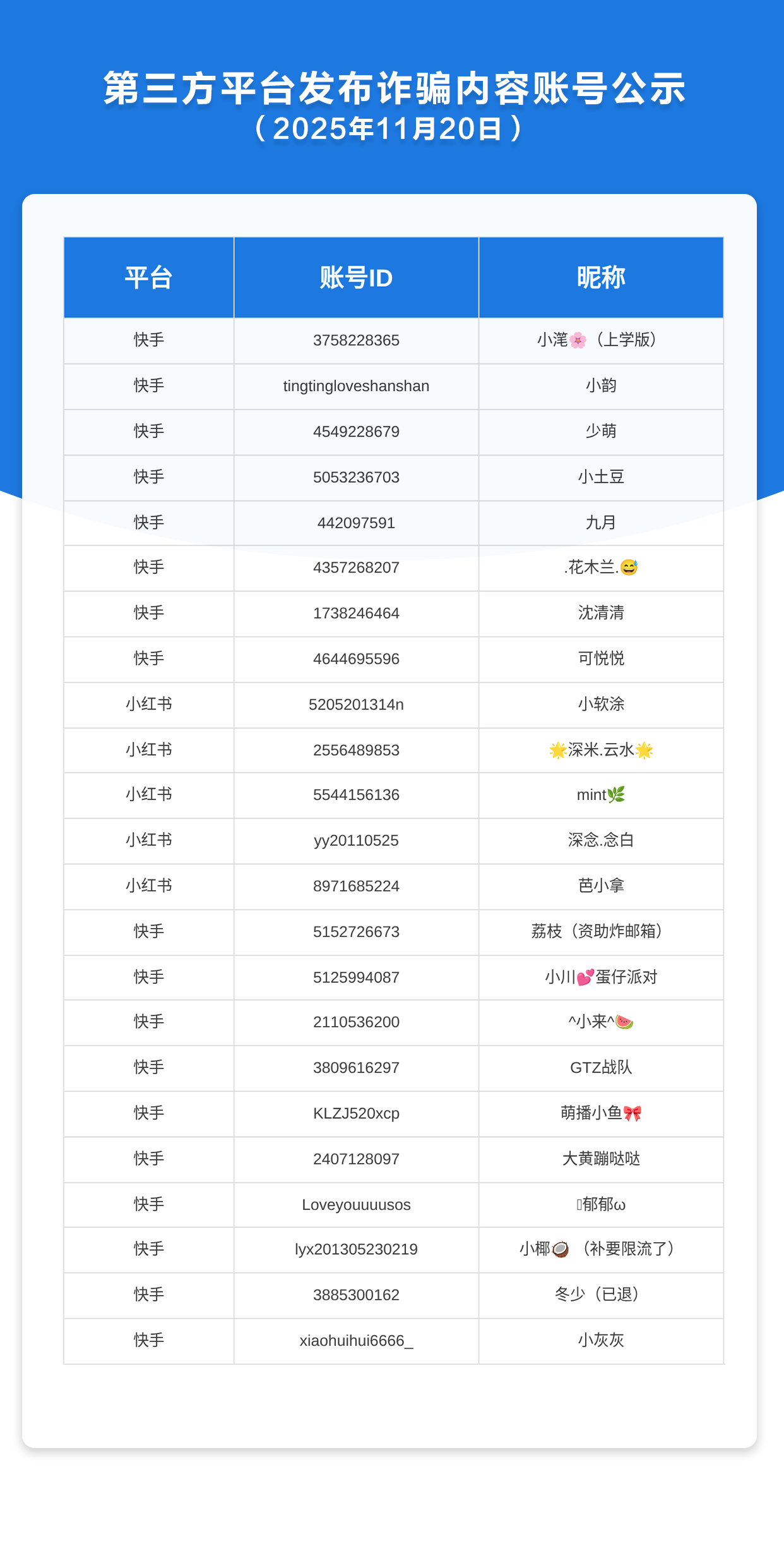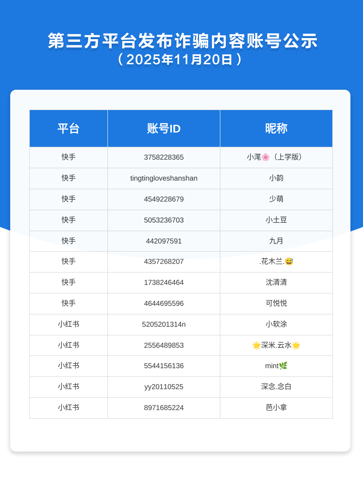 第三方平台发布诈骗内容账号公示(2025年11月20日)