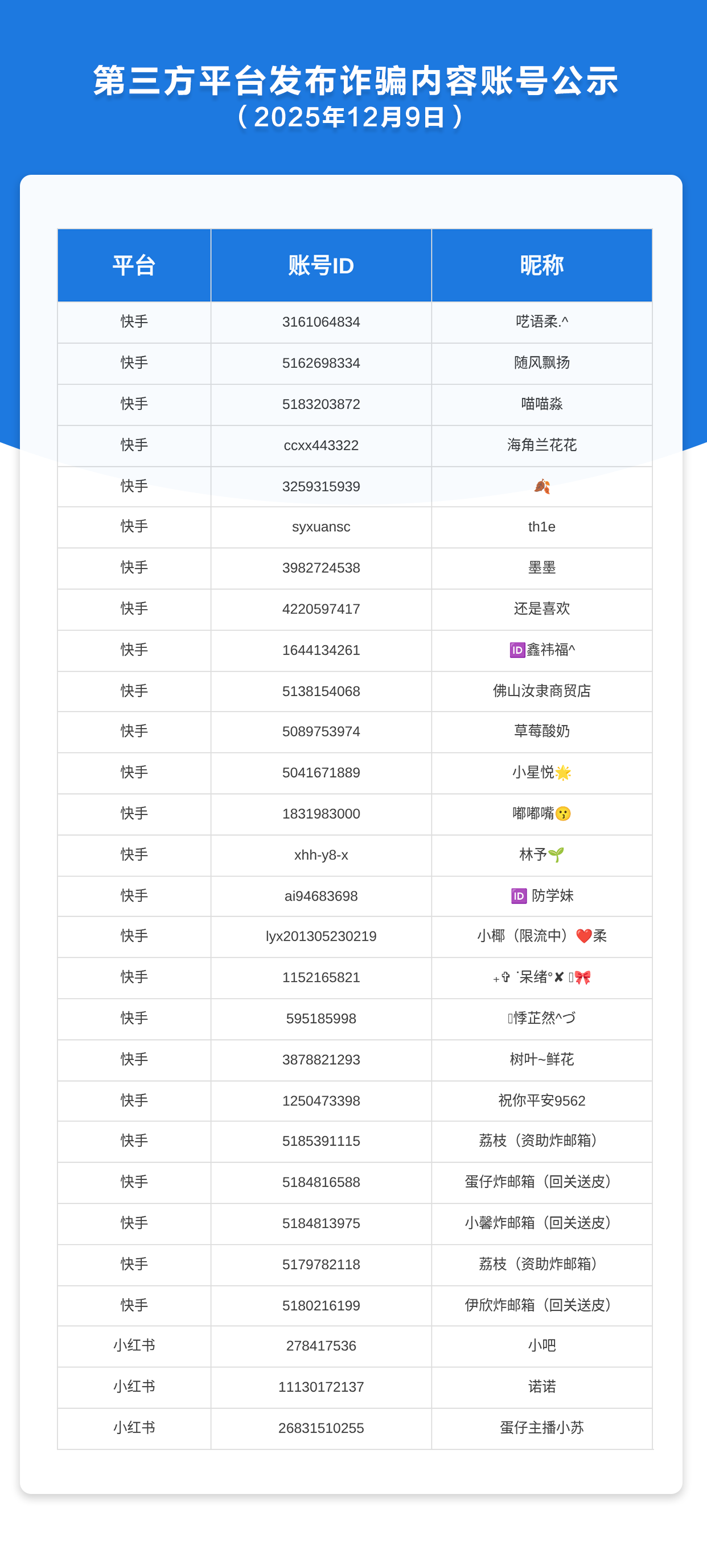 第三方平台发布诈骗内容账号公示(2025年12月9日)
