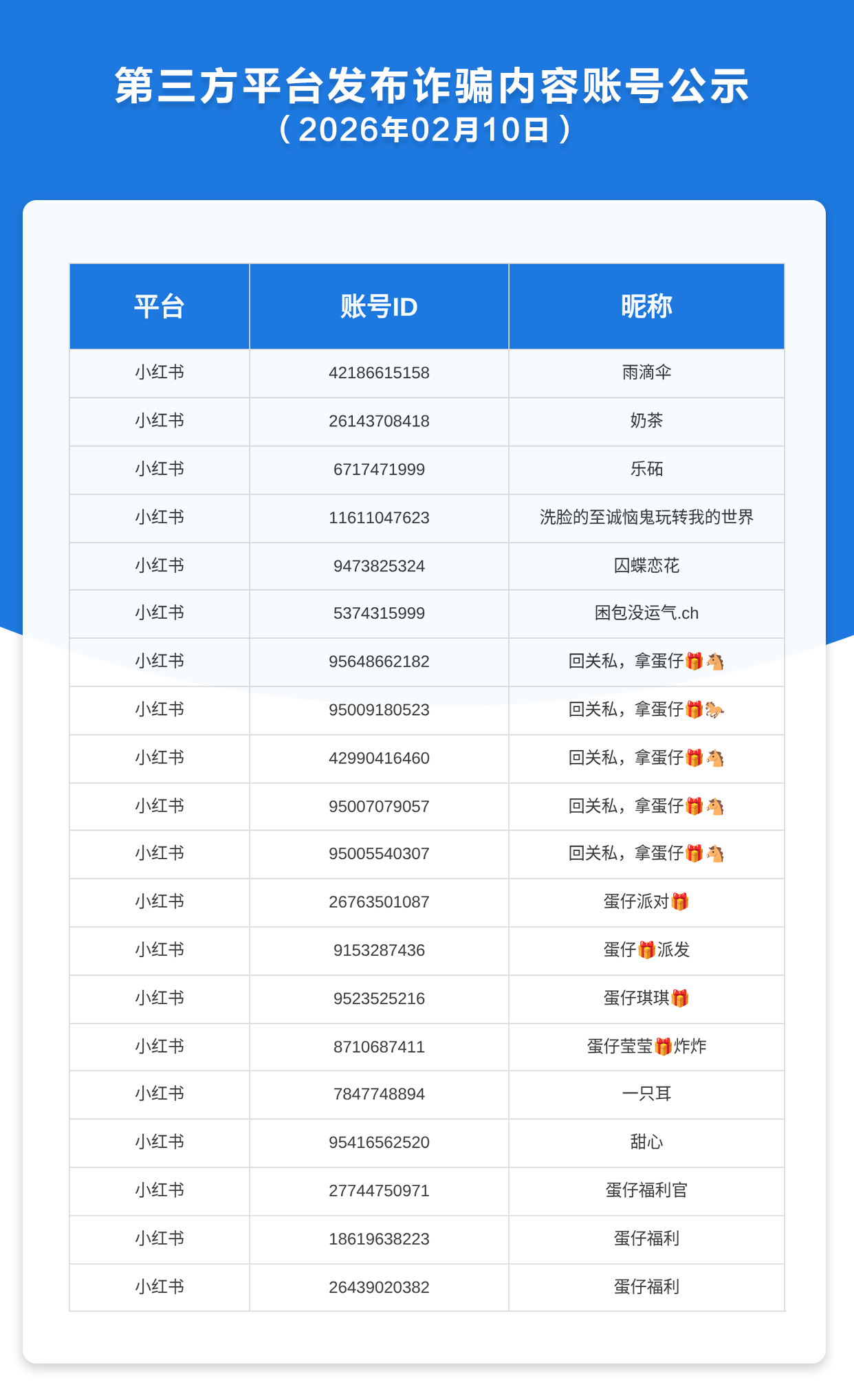 第三方平台发布诈骗内容账号公示(2026年2月10日)