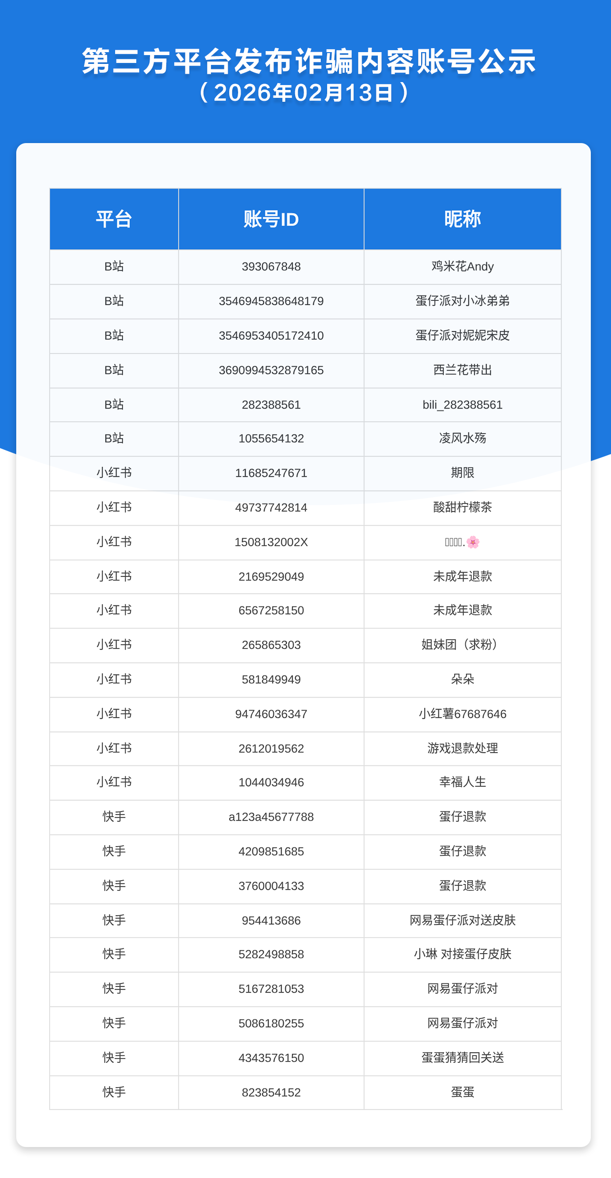 第三方平台发布诈骗内容账号公示(2026年2月13日)