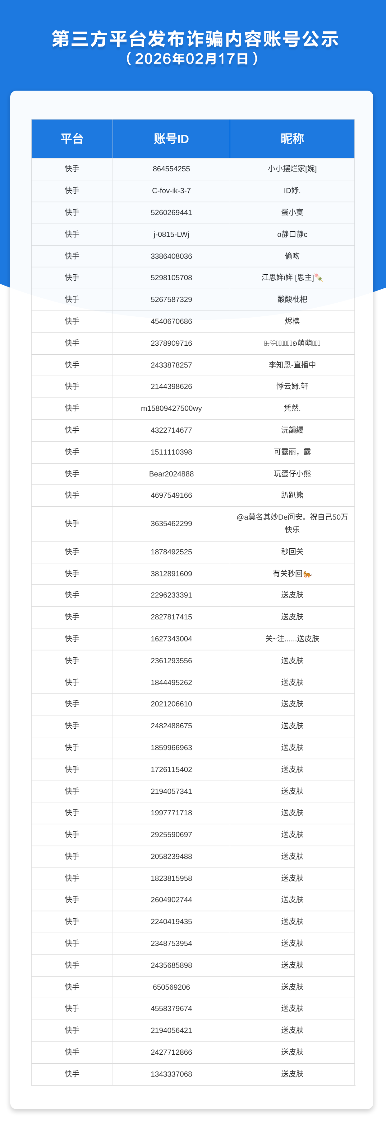 第三方平台发布诈骗内容账号公示(2026年2月17日)