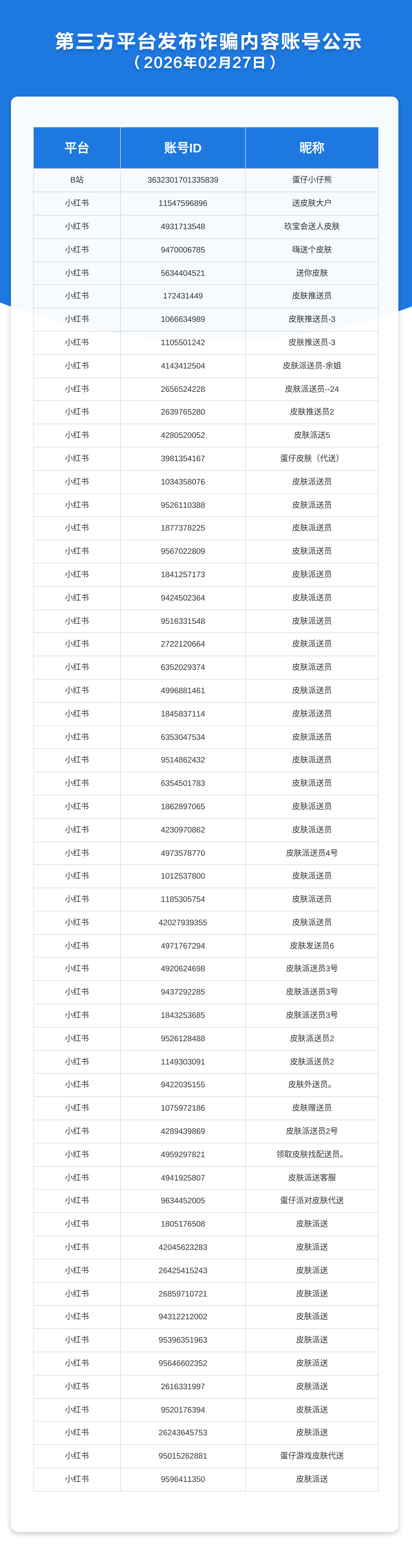 第三方平台发布诈骗内容账号公示(2026年2月27日)