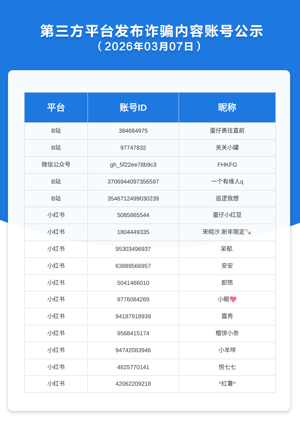 第三方平台发布诈骗内容账号公示(2026年3月7日)