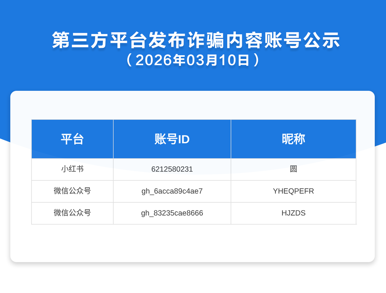 第三方平台发布诈骗内容账号公示(2026年3月10日)